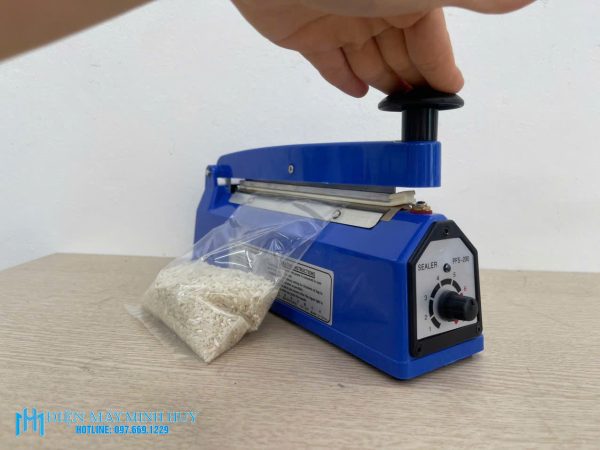- Bước 3: Đặt miệng túi lên đường hàn, sau đó đặt cần dập xuống miệng túi, khi nào đèn báo tắt là đã hàn thành công.